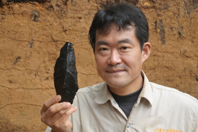 その遺跡から佐久市の友好都市である神津島村産の黒曜石で出来た石器が発見されました。